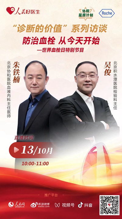 10月13日10:00至11:00,“診斷的價(jià)值”系列訪談之世界血栓日特別節(jié)目——“防治血栓,從今天開始”,特別邀請(qǐng)到北京協(xié)和醫(yī)院血液內(nèi)科主任醫(yī)師朱鐵楠、北京積水潭醫(yī)院檢驗(yàn)科主任吳俊做客“人民好醫(yī)生”直播間,為公眾詳細(xì)解析科普血栓防治相關(guān)內(nèi)容,歡迎屆時(shí)收看。
