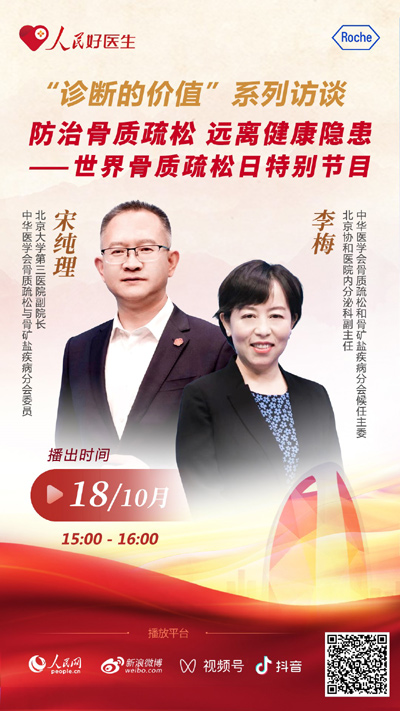 10月20日是世界骨質(zhì)疏松日。作為一種常見骨骼疾病,骨質(zhì)疏松在悄無聲息中破壞著我們的骨骼健康,帶來包括骨折在內(nèi)的一系列疾病風險。那么,哪些人群需要關注骨質(zhì)疏松,骨質(zhì)疏松該如何有效防治,骨骼健康水平又該如何定期評估?10月18日15:00,“診斷的價值”系列訪談之“防治骨質(zhì)疏松 遠離健康隱患——世界骨質(zhì)疏松日特別節(jié)目”,特別邀請到北京大學第三醫(yī)院副院長、中華醫(yī)學會骨質(zhì)疏松與骨礦鹽疾病分會委員宋純理,北京協(xié)和醫(yī)院內(nèi)分泌科副主任、中華醫(yī)學會骨質(zhì)疏松和骨礦鹽疾病分會候任主任委員李梅做客“人民好醫(yī)生”直播間,就骨質(zhì)疏松防治的熱點話題和網(wǎng)友進行分享。