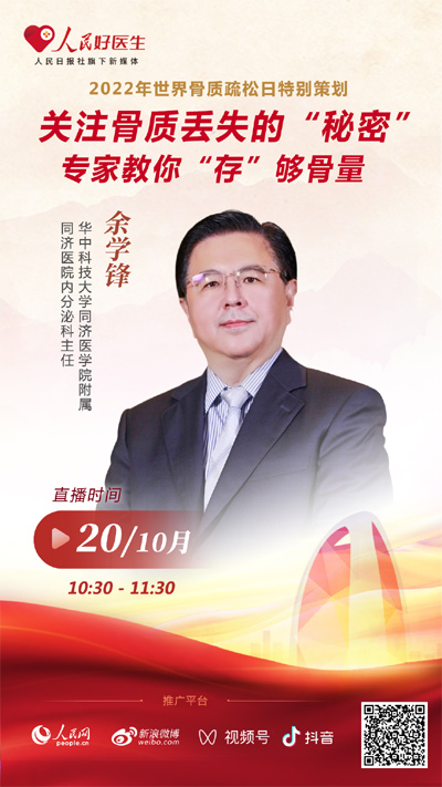 10月20日10:30,華中科技大學同濟醫學院附屬同濟醫院內分泌科主任余學鋒將做客人民日報社旗下新媒體平臺“人民好醫生”客戶端直播間,向廣大網友分享骨質疏松相關知識。