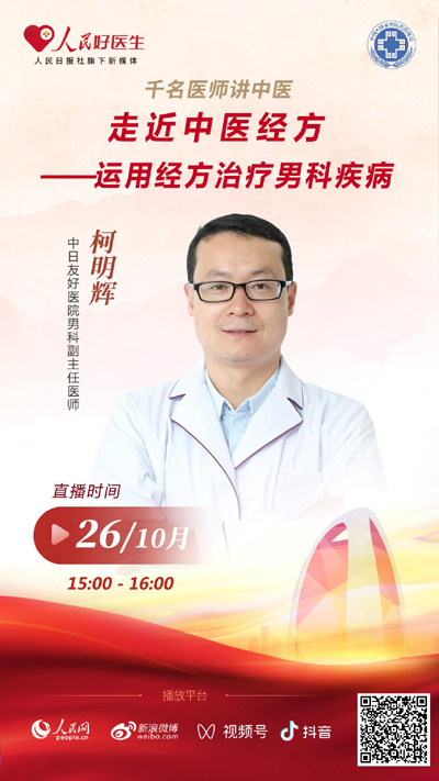 中醫經方有哪些特點?如何將經方運用到男科疾病的治療中?10月26日“人民好醫生”與國家中醫藥管理局辦公室聯合推出的“千名醫師講中醫”系列直播將邀請邀請中日友好醫院男科副主任醫師柯明輝做客直播間,詳細講解男科疾病的中醫治療方法。