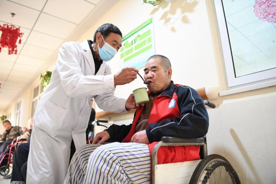 2021年12月28日,河北省景縣人民醫院醫養中心工作人員幫助老人喝水。新華社記者 朱旭東 攝