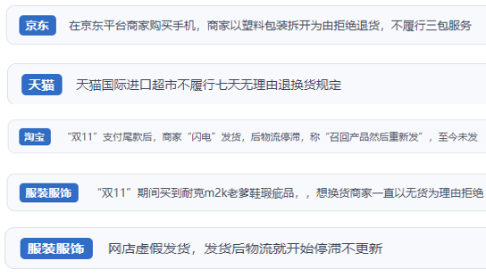 聚焦電商領(lǐng)域,“人民投訴”用戶投訴多聚焦在:平臺自營、旗艦店商品質(zhì)量“雙標”;貨不對板、少發(fā)漏發(fā);退差價、保價設(shè)置“障礙”等方面。服飾美妝領(lǐng)域的突出問題是:以次充好;虛擬發(fā)貨;試穿后或以外包裝損壞為由拒不退貨;預(yù)付比直接買還貴等。