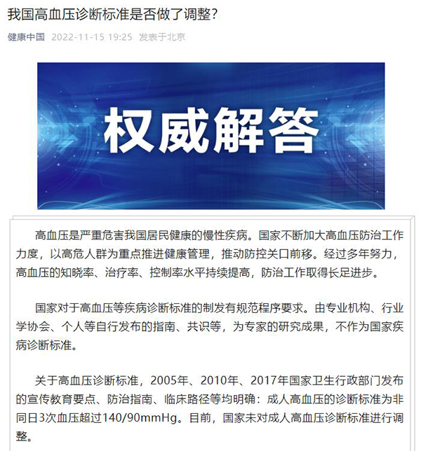 關于高血壓診斷標準,2005年、2010年、2017年國家衛生行政部門發布的宣傳教育要點、防治指南、臨床路徑等均明確:成人高血壓的診斷標準為非同日3次血壓超過140/90mmHg。目前,國家未對成人高血壓診斷標準進行調整。