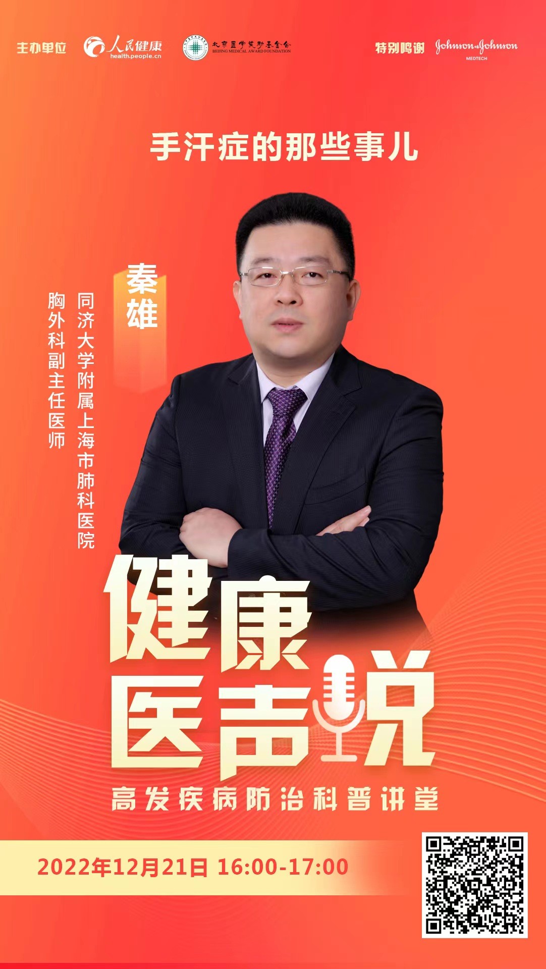 12月21日16:00,同濟大學附屬上海市肺科醫院胸外科副主任醫師秦雄將做客“人民好醫生”客戶端直播間,為廣大網友科普手汗癥相關知識。