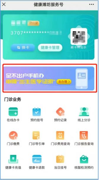 (1)關注微信“健康濰坊服務號”,通過“醫療服務”-->“申領出生醫學證明”進行線上辦理。