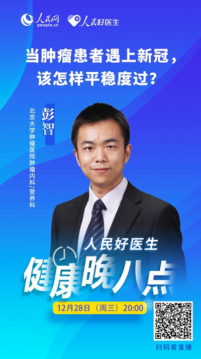 12月28日20:00,“健康晚八點”邀請北京大學腫瘤醫院營養科主任彭智,詳細講解腫瘤患者在疫情期間如何保護自己,怎樣平穩度過,千萬不要錯過。