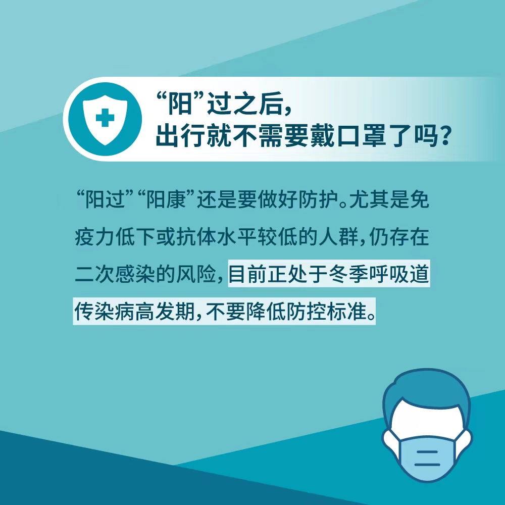 “陽過”“陽康”還是要做好防護(hù)。尤其是免疫力低下或抗體水平較低的人群,仍存在二次感染的風(fēng)險(xiǎn),目前正處于冬季呼吸道傳染病高發(fā)期,新冠康復(fù)后仍要做好呼吸道及其它病毒防護(hù),不要降低防控標(biāo)準(zhǔn)。建議佩戴N95或醫(yī)用口罩,口罩4小時(shí)以上要更換。