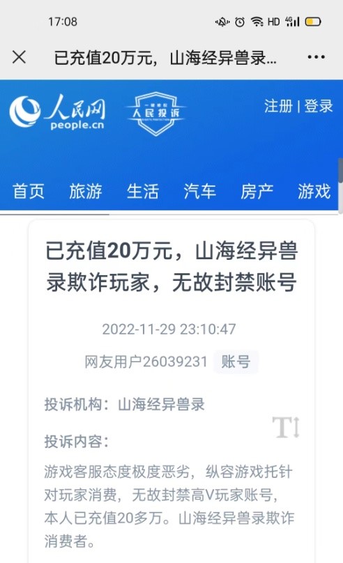 然而,一些游戲公司仍存在虛假宣傳、以不公平規定為自己免責甚至侵害消費者選擇權和財產權的情況。在人民網“人民投訴”平臺的眾多投訴中,對于游戲賬號異常問題、充值以及隱私等問題的投訴屢見不鮮。