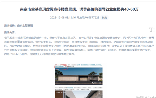 近日,來自南京的網(wǎng)友向“人民投訴”平臺反映,南京某樓盤在銷售時,將小區(qū)主大門和會所一樓及景觀作為重要宣傳賣點,以高于周邊樓盤3000元左右每平方米的價格售賣,很多消費者都為了景觀買單。但購房完成后,開發(fā)商擅自更改規(guī)劃,之前宣傳的賣點全部變?yōu)槠渌δ軈^(qū),且未做任何明確告知。小區(qū)景觀遭到破壞,實質(zhì)上房產(chǎn)溢價已經(jīng)消失,給消費者造成了重大財產(chǎn)損失。