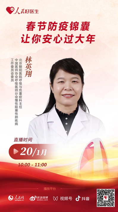 1月20日10:00至11:00,北京朝陽(yáng)醫(yī)院呼吸與危重癥科主任、中國(guó)醫(yī)師協(xié)會(huì)呼吸醫(yī)師分會(huì)慢性阻塞性肺疾病工作委員會(huì)委員林英翔將做客“人民好醫(yī)生”APP直播間,為廣大網(wǎng)友送上春運(yùn)防疫錦囊。歡迎屆時(shí)收看。