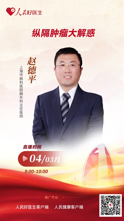 3月4日9:00至10:00,上海市肺科醫(yī)院胸外科主任醫(yī)師趙德平將做客“人民好醫(yī)生”客戶端,圍繞縱隔腫瘤相關(guān)問題進(jìn)行交流分享,歡迎屆時收看。