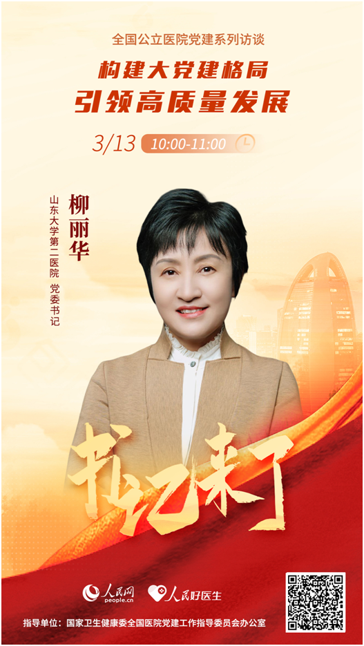 加強學科建設,提升患者就醫滿意度是公立醫院高質量發展的一個重要維度。如何通過高質量黨建引領醫院學科建設,滿足患者的疾病臨床需求,提升診療能力和服務水平?3月13日10:00,山東大學第二醫院黨委書記柳麗華將做客《書記來了》,與大家分享醫院在加強黨建、改善人民群眾就醫體驗等方面的經驗和做法,敬請關注。