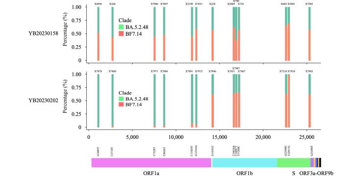 研究人員于2023年1月28日和2月7日從患者身上采集上呼吸道樣本,分別命名為YB20230158和YB20230202,這兩個樣本形成了一個獨立的分支,不同于奧密克戎亞變體BA.5.2.48和BF.7.14。突變位點分析顯示,兩個樣本都含有奧密克戎亞變體BA.5.2.48和BF.7.14的特異性定義位點,患者同時感染了奧密克戎亞變體BA.5.2.48和BF.7.14。
