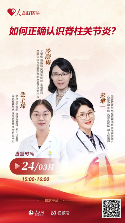 3月24日15:00,“人民好醫生”客戶端邀請北京協和醫院風濕免疫科主任醫師冷曉梅、北京協和醫院風濕免疫科副主任醫師張上珠、北京協和醫院風濕免疫科副主任醫師彭琳一做客演播室,為公眾科普脊柱關節炎診治的相關知識。
