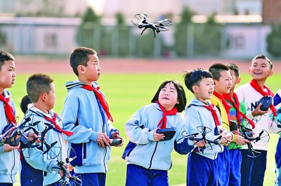 內蒙古呼和浩特市賽罕區大學路小學教育集團西把柵校區的學生在體驗操控無人機。新華社發