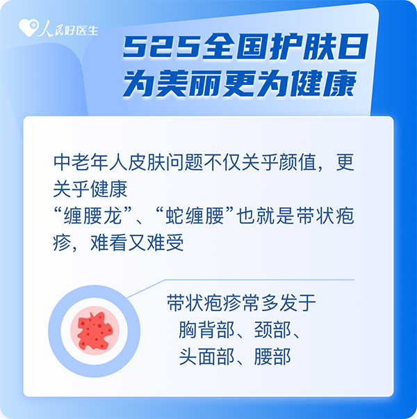 5月25日是全國(guó)護(hù)膚日,愛自己從愛護(hù)皮膚開始。而對(duì)于中老年人來(lái)說(shuō),皮膚問題不僅關(guān)乎顏值,更關(guān)乎健康。帶狀皰疹俗稱“纏腰龍”,除了會(huì)出現(xiàn)紅斑、丘皰疹、水皰等皮膚損傷癥狀外,還會(huì)伴隨劇烈疼痛,嚴(yán)重影響了中老年人的身體健康和日常生活。