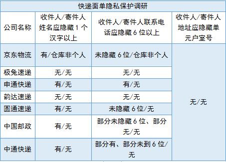 針對在新國標開始實施后,快遞公司的快遞面單是否按照新國標的要求對寄件人和收件人的個人信息進行了保護,調查發現,7家快遞公司快遞面單寄件人的信息沒有任何隱藏保護,收件人的地址沒有隱藏單元戶室號。收件人聯系電話隱藏6位以上的極少。同一家快遞公司的面單,也存在著部分面單未做隱私保護的情況。