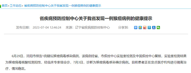 人民網北京7月4日電 (記者孫紅麗)據遼寧省疾病預防控制中心官網消息,6月29日,沈陽市報告1例疑似猴痘病毒感染病例,該病例經省、市疾控中心實驗室檢測及中國疾控中心復核,實驗室檢測結果為猴痘病毒核酸檢測陽性,經臨床專家組會診,7月3日,診斷為猴痘病毒感染確診病例。目前患者正在定點醫療機構進行隔離治療,情況穩定。