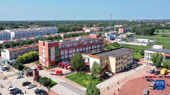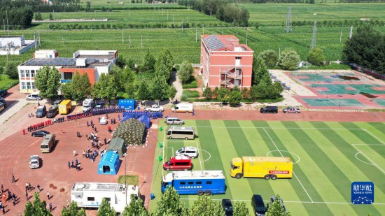 8月6日,在平原縣王打卦中心小學,應急救援隊伍集結待命(無人機照片)。新華社記者 郭緒雷 攝