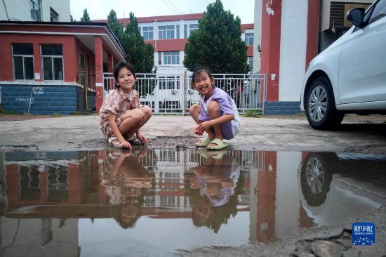 8月6日,在平原縣王打卦鎮,兩名小朋友在水邊玩耍。新華社記者 郭緒雷 攝