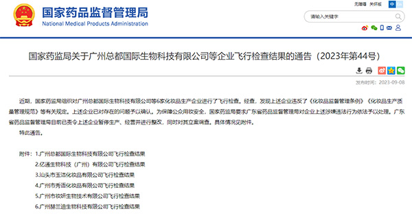 人民網北京9月12日電 (記者孫紅麗)國家藥監局近日發布《關于廣州總都國際生物科技有限公司等企業飛行檢查結果的通告》(以下簡稱《通告》)稱,近期,國家藥監局組織對廣州總都國際生物科技有限公司、億通生物科技(廣州)有限公司、汕頭市玉潔化妝品有限公司、廣州市秀語化妝品有限公司、廣州市妝妍生物技術有限公司、廣州赫蘭迪生物科技有限公司等6家化妝品生產企業進行了飛行檢查。經查,發現上述企業違反了《化妝品監督管理條例》《化妝品生產質量管理規范》等有關規定。上述企業已對存在的問題予以確認。