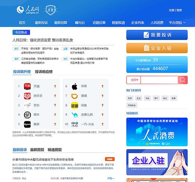 人民網(wǎng)“人民投訴”平臺新版頁面截圖。