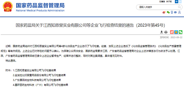 《通告》稱,近期,國家藥監(jiān)局組織對江西知恩堂實業(yè)有限公司、金發(fā)拉比婦嬰童用品股份有限公司、廣東康百納生物科技有限公司、暨研醫(yī)藥生物科技(廣州)有限公司等4家化妝品生產企業(yè)進行了飛行檢查。經查,發(fā)現(xiàn)上述企業(yè)違反了《化妝品監(jiān)督管理條例》《化妝品生產質量管理規(guī)范》等有關規(guī)定。上述企業(yè)已對存在的問題予以確認。