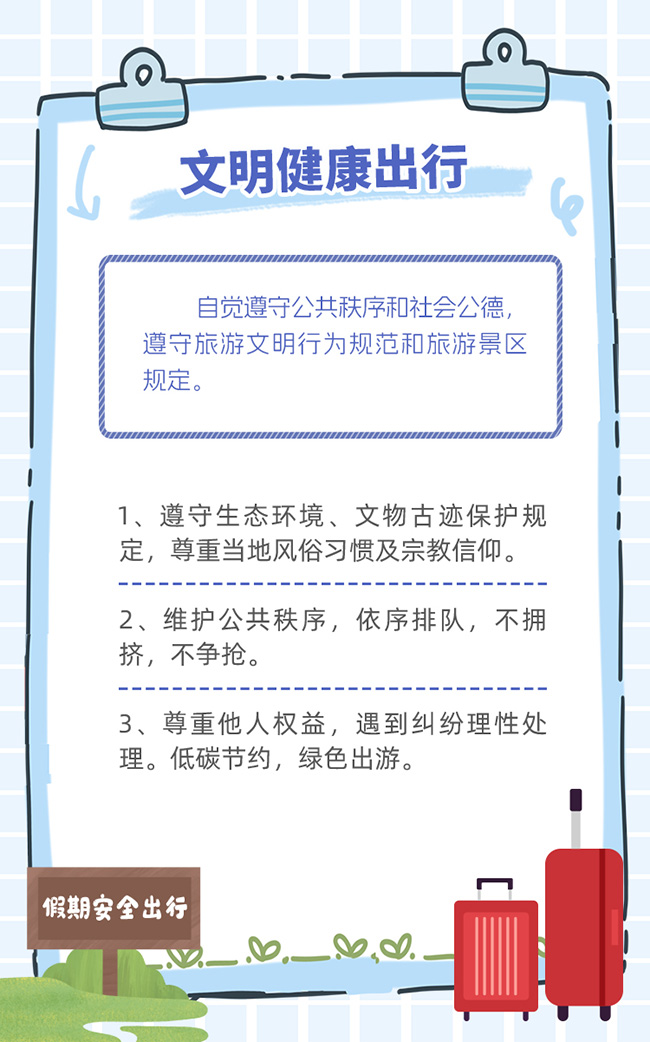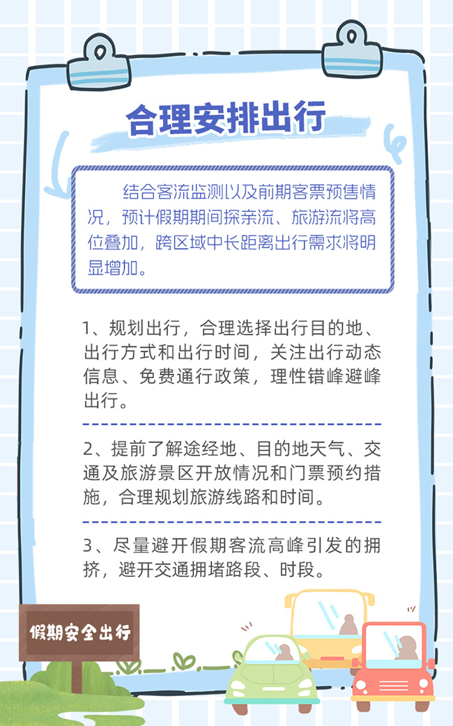 編者按:今年的中秋、國慶“兩節”假期長達8天,讓大家的出行熱情格外高漲。近日,全國各地陸續迎來出行高峰,假期外出游玩、走親訪友,一定要做好充分準備、注意出行安全。這份提示請收好!