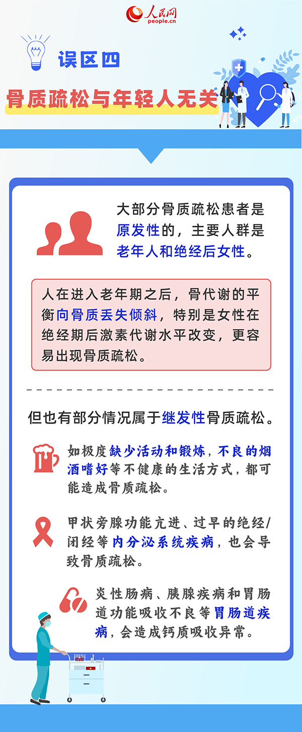 編者按:今天(10月20日)是世界骨質疏松日。骨質疏松是以骨量減少、骨組織微結構破壞,骨骼脆性增加和易發生骨折為特點的全身性疾病。隨著人口的老齡化,骨質疏松已經成為全世界的健康問題。很多人認為,骨質疏松是老年人該關心的事。其實不然,骨質疏松的預防應從兒童時期開始。另外,還要認清這些常見誤區,養成正確的飲食習慣,從而有效減少骨質疏松的發生。
