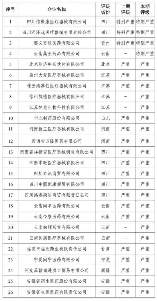 4家評級為“特別嚴重”的醫藥企業分別為四川倍聚康醫療器械有限公司、四川潤澤遠醫療器械有限責任公司、遵義百頤醫藥有限公司、云南集業藥品有限公司。22家評級為“嚴重”的醫藥企業包括北京能濟中藥飲品有限公司、泰州大愛醫療器械有限公司、連云港蘇創醫療器械有限公司等。