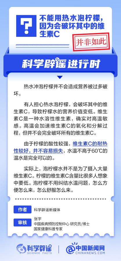 熱水沖泡檸檬并不會造成營養被過多破壞。維生素C是一種水溶性維生素,確實對高溫敏感。高溫會加速維生素C的氧化和分解過程,但并不會完全破壞所有的維生素C。(來源:@科學辟謠 中國新聞網微博)