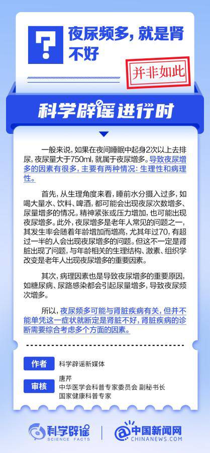 導致夜尿增多的因素有很多,從生理角度來看,睡前水分攝入過多,精神緊張或壓力增加,都可能出現夜尿增多。此外,夜尿增多是老年人常見的問題之一,其發生率會隨著年齡增加而增高。夜尿頻多可能與腎臟疾病有關,但并不能單憑這一癥狀就斷定是腎臟不好,腎臟疾病的診斷需要綜合考慮多個方面的因素。(來源:@科學辟謠 中國新聞網微博 )