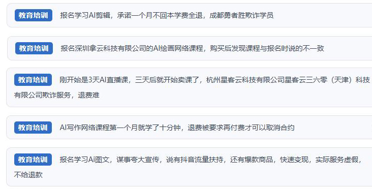 然而,“人民投訴”經梳理發現,網絡上不少消費者吐槽相關課程質量良莠不齊,與廣告承諾“免費領取AI應用體驗課及AI工具”“低投入、高回報”“副業賺錢”“快速變現”等內容大相徑庭。相關商家虛假宣傳、誘導消費、貨不對板以及退費難等問題被反復提及。