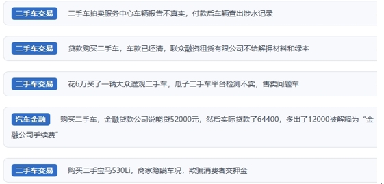 車輛報告弄虛作假,如私自篡改修車記錄、涉水記錄、里程記錄、保險信息、違章信息等,消費者付款后車輛到手使用時方才知曉;商家魚目混珠、以次充好,刻意隱瞞車輛來源,運營車充當非運營車輛賣,涉案車輛充當正常車輛賣;訂金、押金、保證金隨意收,取消交易后商家拒不退還;交易合同陷阱多,發票真假難辨,車輛售后維修服務難保障;實際貸款數額與申請額度不符、手續費多少不明了、提前還款收取高額違約金,金融貸款“陷阱”防不勝防……