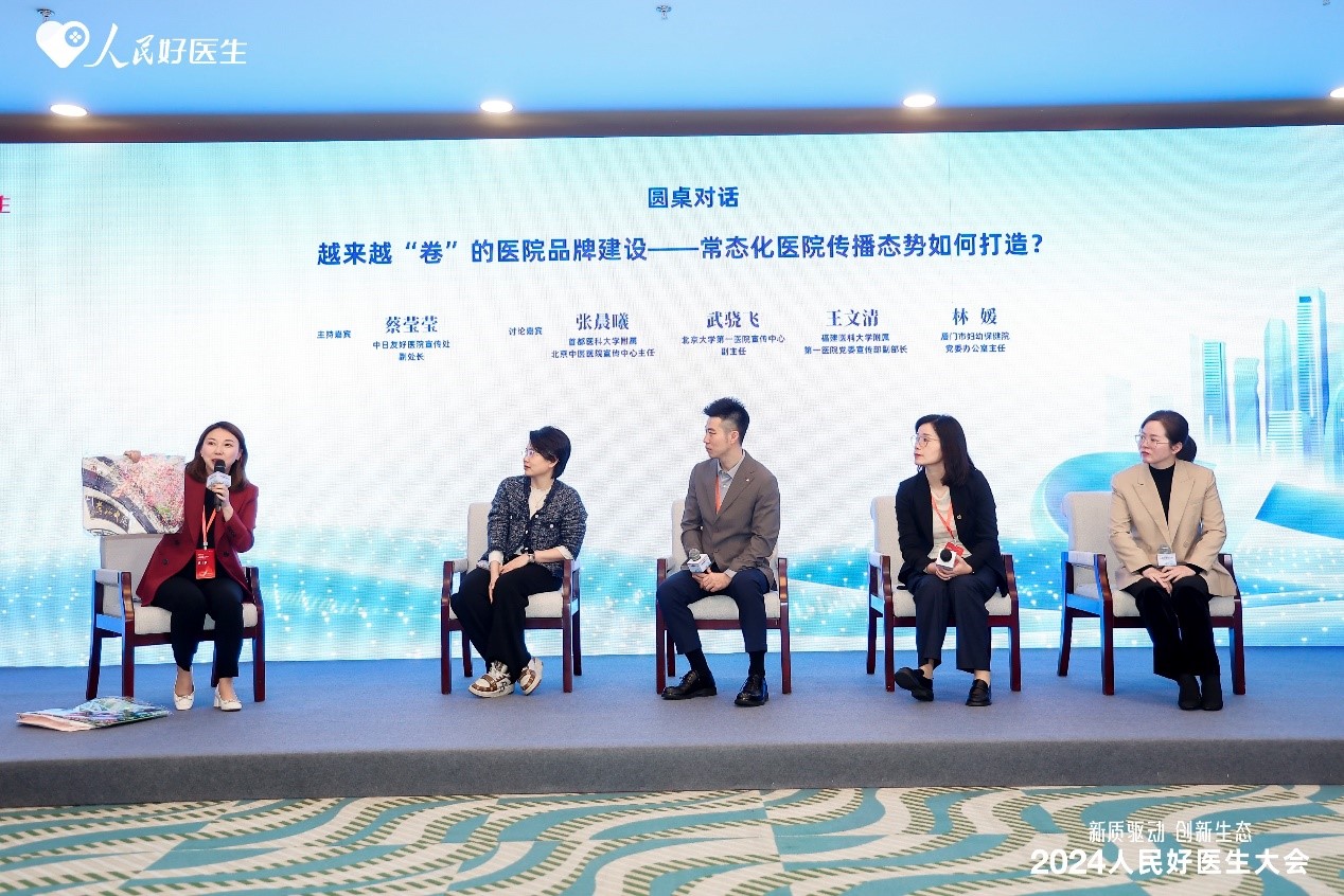在“越來越‘卷’的醫院品牌建設——常態化醫院傳播態勢如何打造?”圓桌討論中,中日友好醫院宣傳中心副主任蔡瑩瑩,北京大學第一醫院宣傳中心副主任武驍飛,首都醫科大學附屬北京中醫醫院宣傳中心主任張晨曦,福建醫科大學附屬第一醫院黨委宣傳部副部長王文清和廈門市婦幼保健院黨委辦公室主任林媛圍繞進行討論,分享了醫院品牌建設的經驗和做法。