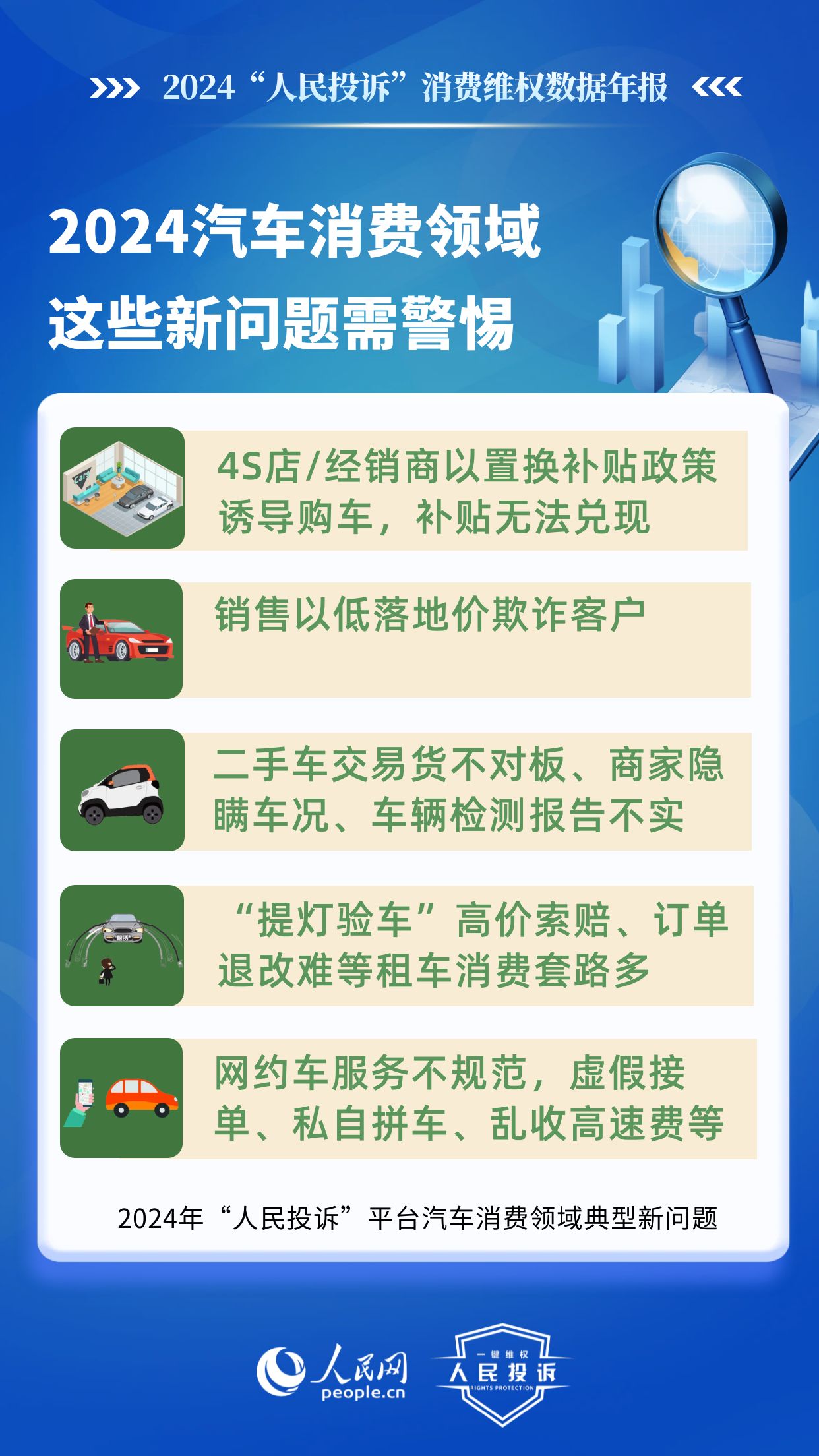新問題體現在:4S店/經銷商以置換補貼政策誘導購車,結果補貼無法兌現;銷售以低落地價欺詐客戶;二手車交易貨不對板、商家隱瞞車況、平臺車輛檢測報告不實;惡意租“故障車”、“提燈驗車”高價索賠、低價誘租、訂單退改難等租車消費套路多;網約車服務不規范,人車不符、虛假接單、私自拼車、亂收高速費等。