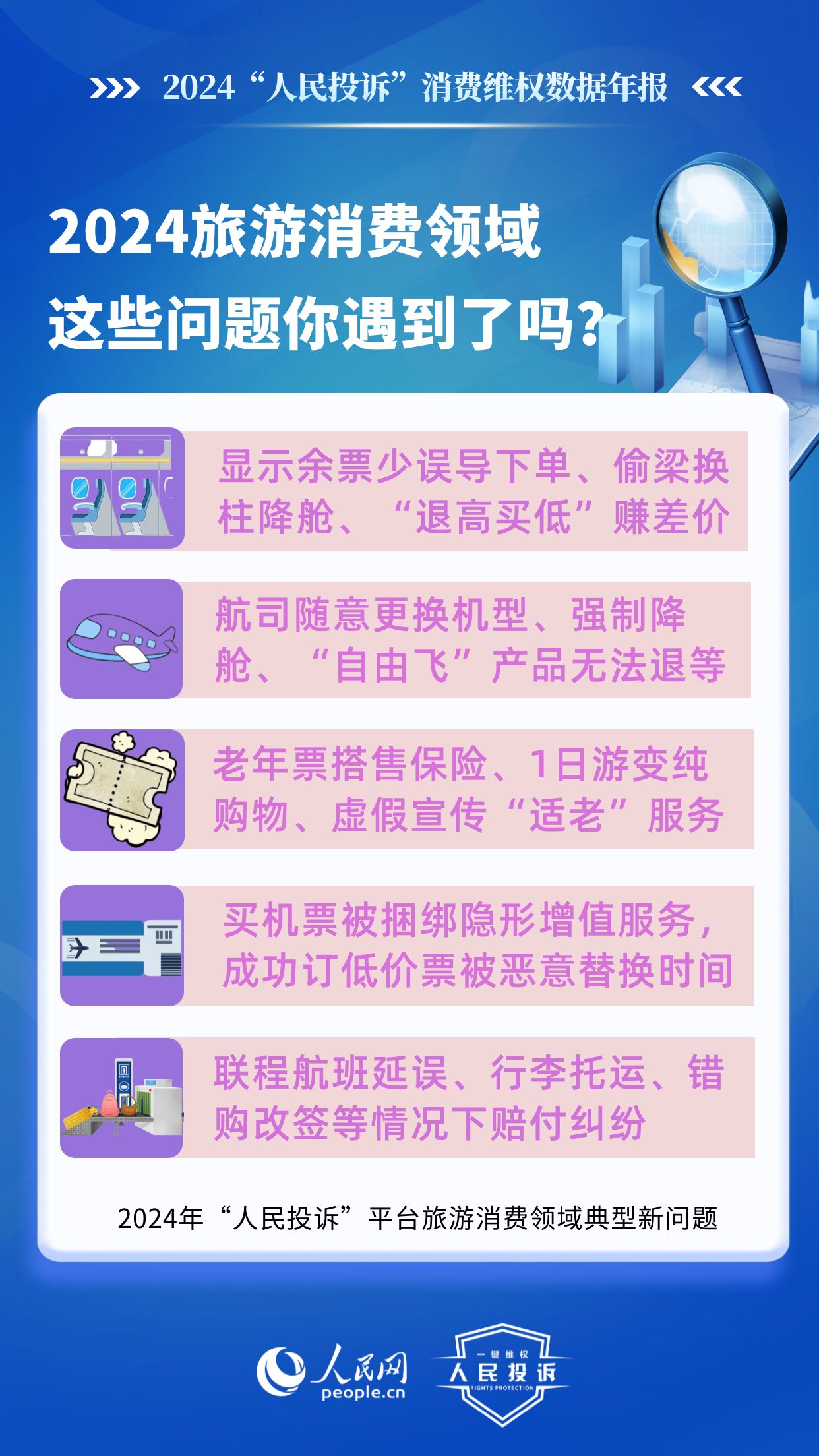 “人民投訴”分析,綜合消費品“以舊換新”政策全面鋪開、旅游消費持續火爆,政府補貼疊加網絡促銷活動,直播電商向“品質直播”轉型、大力發展銀發經濟等等政策環境背景下,2024年消費潛力加速釋放,但不乏個別商家/機構/平臺鉆空子,設置各種“套路”“陷阱”,侵蝕消費者“紅利”、“割韭菜”牟取不當利益。