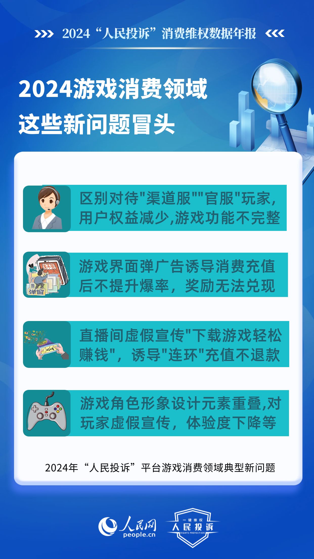 在游戲類,老問題主要有:未成年人網游消費不規范,平臺以“免費”“紅包”誘導點擊充值,未身份驗證、支付環節無提示,提交證據申請退款遭拒或退款金額不合理;虛假宣傳游戲內容誘導充值點券,玩家實際回報/游戲體驗與預期不符;無故封號、游戲裝備丟失、賬號被盜、系統漏洞導致玩家利益受損,客服不回應、平臺不理;系統漏洞、卡頓閃退、匹配機制失衡等網游體驗差等。