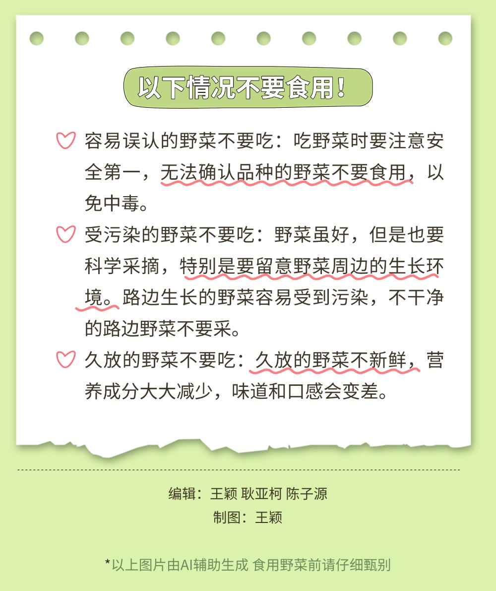 風(fēng)一吹,大地就悄悄藏好了禮物。那些不起眼的角落,冒頭的野菜正等著被認(rèn)領(lǐng)。有人說(shuō),挖野菜是成年人的“自然尋寶游戲”。貓著腰,撥開草叢,發(fā)現(xiàn)一簇鮮嫩的綠,像拆開大地饋贈(zèng)的盲盒。如何將野菜吃得健康、吃得安全?一圖了解野菜的正確打開方式。