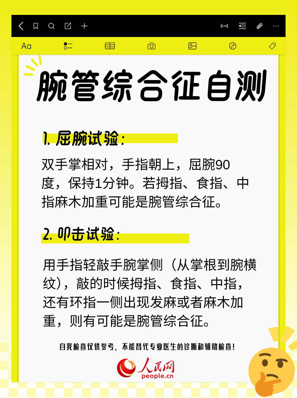 宋德恩提醒說,自測方法僅供參考,實際生活中這兩種疾病可能同時存在,癥狀也可能與其他疾病,例如糖尿病周圍神經病變、肘管綜合征、胸廓出口綜合征等混淆?!叭羰致?、疼痛持續超過1周,或出現肌肉無力、拿東西不穩,別硬扛,及時去手外科或顯微外科就診?!彼蔚露骱粲酰绨l現、早調整、早治療,能減少很多麻煩。