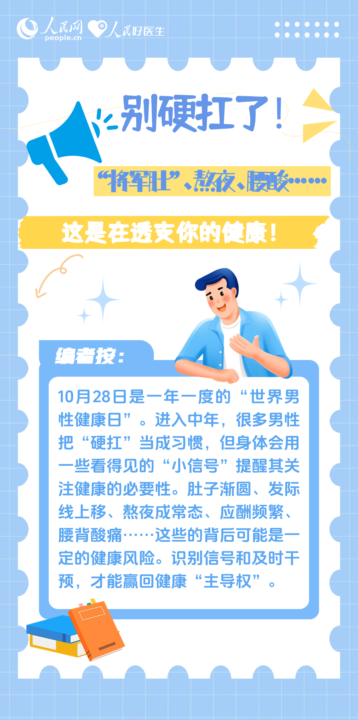 編者按:10月28日是一年一度的“世界男性健康日”。進入中年,很多男性把“硬扛”當成習慣,但身體會用一些看得見的“小信號”提醒其關注健康的必要性。肚子漸圓、發際線上移、熬夜成常態、應酬頻繁、腰背酸痛……這些的背后可能暗藏著健康風險。識別信號和及時干預,才能贏回健康“主導權”。
